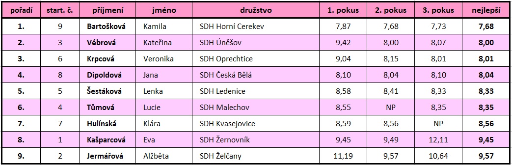 Mezi ženami potvrdila roli favoritky držitelka putovního poháru z úvodního ročníku Kamila Bartošková z SDH Horní Cerekev, která postoupila do druhé části z prvního místa. Ve finále pak prokázala svoji suverenitu vítězstvím nad Veronikou Krpcovou z SDH Oprechtice, která tak obhájila pozici „věčně stříbrné“ závodnice z předchozích dvou ročníků. Bronzovou příčku obsadila Kateřina Vébrová, reprezentující dobrovolný sbor z Úněšova.