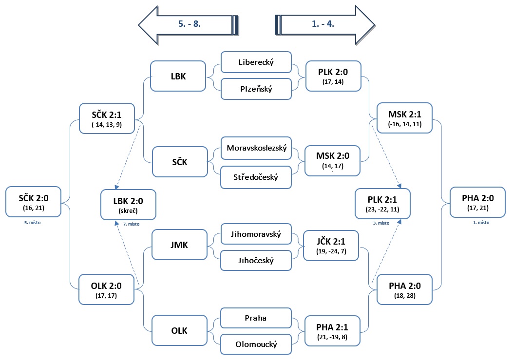 Změřit síly pod vysokou sítí přijelo do věhlasného sportovního areálu na břehu Labe dvanáct krajských týmů a také výběr generálního ředitelství. Na úvod turnaje byla družstva rozdělena do čtyř skupin s tím, že nejlepší čtyři celky z loňského ročníku byly nasazeny a další týmy k nim byly přiřazeny losem. Ve skupinách se hrálo systémem každý s každým na dvě vítězné sady, za stavu 1:1 rozhodovala o vítězi zkrácená hra. Družstva na prvních dvou místech postoupila do finálové vyřazovací části, zbývající se utkala o 9. až 13. místo opět ve skupině každý s každým.