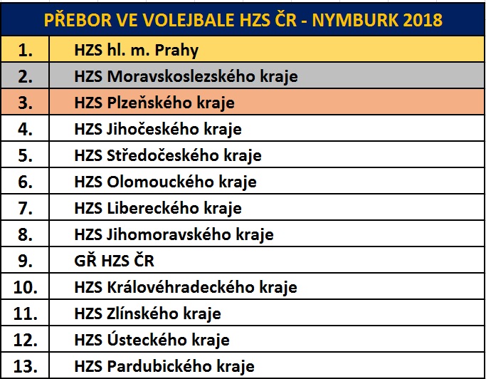 Tým HZS Středočeského kraje postoupil do finálové části, když v základní skupině D jednou prohrál (s pozdějším celkovým vítězem) a jednou vyhrál. V boji o postup do semifinále však domácí celek pod vedením trenérky Pavly Kellerové podlehl favorizovaným Západočechům. Chuť si ale spravil v následném utkání s HZS Libereckého kraje, které i oproti předpokladům bookmakerů po nadšeném a obětavém výkonu otočil po prohraném prvním setu a vyhrál. Tím postoupil do „malého“ finále o páté místo, ve kterém se střetl s velice kvalitním týmem Olomouckého kraje. Na vítězné vlně však pokračoval i v tomto zápase a ve dvou setech zvítězil. V konečném pořadí si tak středočeští hasiči o jednu příčku vylepšili loňské umístění.