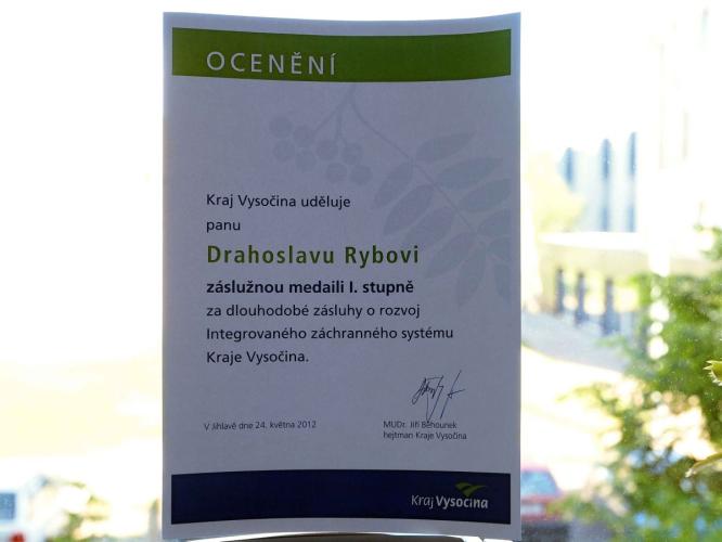 25. 5. 2012 (Nicole Zaoralová) - Generální ředitel HZS ČR, plk. Ing. Drahoslav Ryba převzal včera, 24. května 2012, v Horáckém divadle v Jihlavě od hejtmana Kraje Vysočina MUDr. Jiřího Běhounka, Záslužnou medaili I. stupně. Ta je výrazem poděkování za celoživotní práci v požární ochraně a dlouhodobé zásluhy o rozvoj Integrovaného záchranného systému Kraje Vysočina.