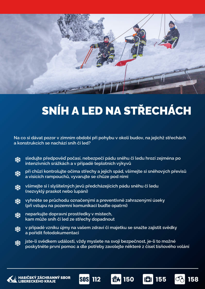 • sledujte předpověď počasí, nebezpečí pádu sněhu či ledu hrozí zejména po intenzivních srážkách a v případě teplotních výkyvů