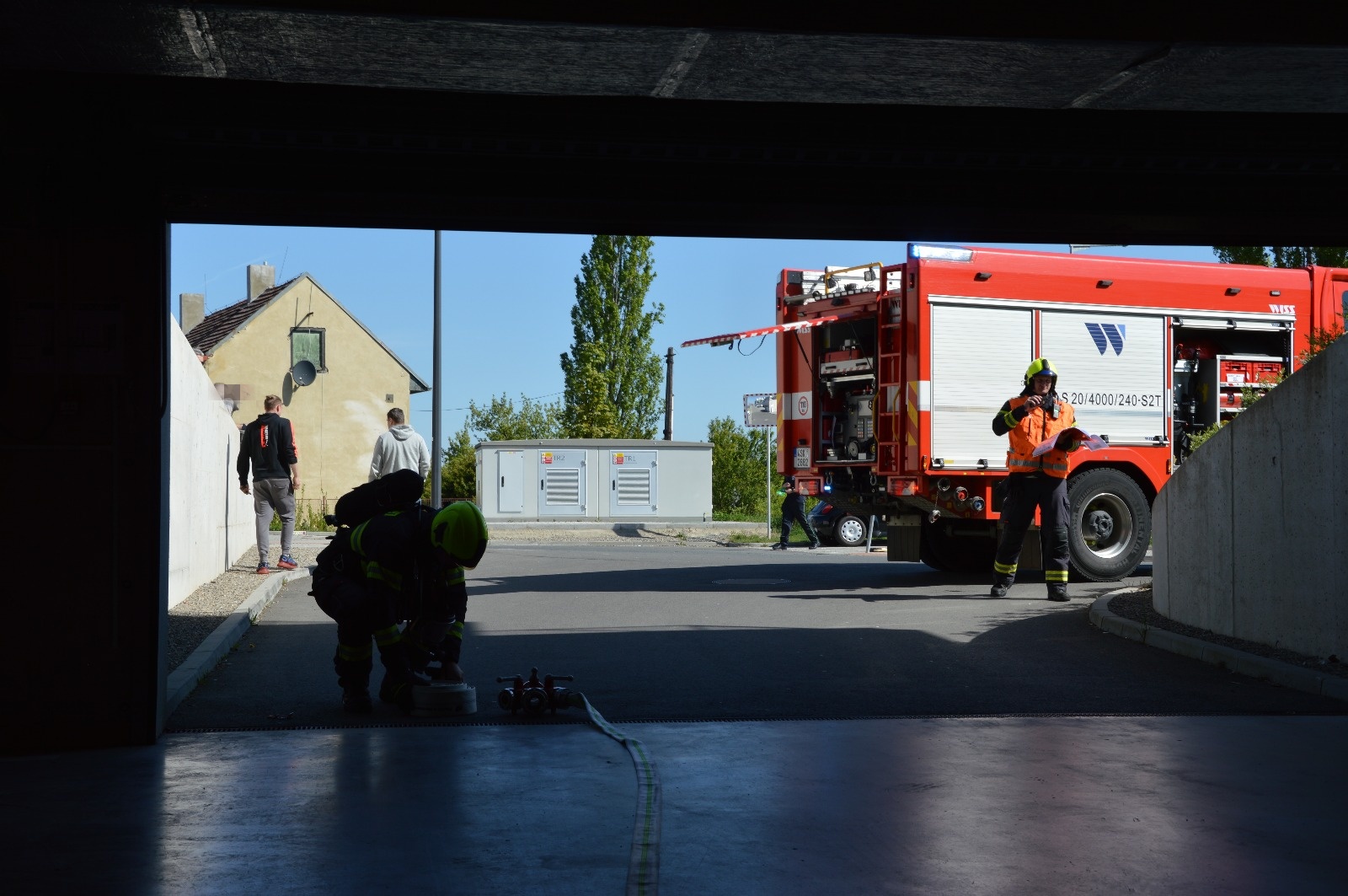 Jelikož šlo o prověřovací cvičení, tak operační důstojník vyslal na místo profesionální hasiče z Kladna, Slaného a Roztok a dobrovolné hasiče obcí Horoměřice a Úholičky. První jednotky na místě zásahu vytvořily dopravní vedení a útočný proud. Dobrovolná jednotka Úholičky zřídila na místě čerpací stanoviště. Jelikož byla nad podzemními garážemi mateřská škola, bylo požářiště rozděleno na dva úseky – jeden se zaměřil na samotnou likvidaci požáru a druhý na evakuaci dětí z mateřské školy.