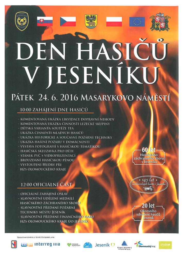 V pátek 24. června 2016 proběhne v Jeseníku na Masarykově náměstí Den hasičů. V rámci něj oslaví hasiči tři významná jubilea, a to 60 let profesionálních hasičů v Jeseníku, 145 let dobrovolných hasičů v Jeseníku a 20 let od vzniku okresního sdružení hasičů Čech, Moravy a Slezska v Jeseníku.