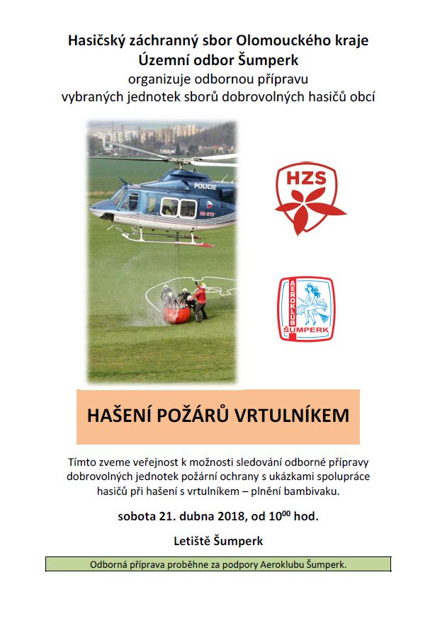 Odbornou přípravu jednotek dobrovolných hasičů vybraných obcí organizuje Hasičský záchranný sbor Olomouckého kraje, územní odbor Šumperk na letišti v Šumperku. Na místě bude pro širokou veřejnost připravena statická ukázka výjezdové techniky profesionálních hasičů ze Šumperku.