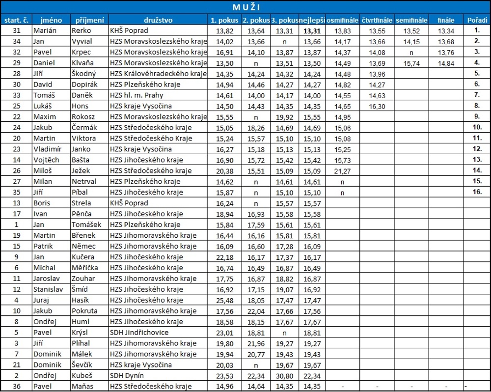 Mezi muži se o překvapení postaral Marian Rerko z HaZZ Poprad. Při jeho pokusech se časomíra vždy zastavila pod čtrnácti sekundami. Ve třetím pokusu pak slovenský borec časem 13,31 s vytvořil nový rekord příbramského halového mítinku. Ve finálovém rozběhu se s ním o zlatou medaili utkal Jan Vyvial z HZS Moravskoslezského kraje, ale Rerko dominoval i ve svém posledním vystoupení. O zbylé místo na stupních vítězů svedli souboj kolegové z HZS Moravskoslezského kraje Pavel Krpec a Daniel Klvaňa, cenný bronz vybojoval Krpec. Až dosud historickým tabulkám kraloval letos „bramborový“ Klvaňa, který ve finále v roce 2021 zastavil časomíru na hodnotě 13 a půl sekundy.