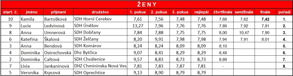 Mezi ženami opět obhájila prvenství z minulých let Kamila Bartošková z SDH Horní Cerekev. Navíc časem 7,42 s, který byl nejen nejlepším ženským výkonem dne, ale zároveň i novým rekordem trati, když svůj vlastní zápis z loňska vylepšila o jednu setinu sekundy. Ve finálovém rozběhu porazila Lucii Ledvinovou z SDH Úněšov, která se tak mohla těšit ze stříbra. Na třetím místě se umístila Anna Umnerová z SDH Dobřany.