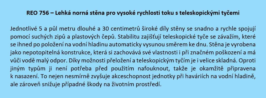 Lehké norné stěny s teleskopickými tyčemi REO 756, jejichž pořizovací hodnota byla přibližně 225 tisíc korun, jsou vcelku jednoduše spojitelným a zároveň velmi účinným prostředkem, který se používá k zastavení šíření případného úniku nebezpečných látek z vodního díla nebo prostředků lodní přepravy po hladině vodního toku. Nebezpečné látky se však do vodního toku mohou dostat i jinými způsoby, jako se například ukázalo při zásahu jednotek požární ochrany v březnu letošního roku, kdy nákladní vozidlo prorazilo zábradlí Vesteckého mostu a spadlo do Vltavy. Následkem nehody pak došlo k poměrně velkému úniku provozních kapalin. Doplněním stávajícího vybavení příbramské jednotky o dalších osm kusů norných stěn se zvýší celková délka těchto prostředků ze 126,5 m na úctyhodných 170,5 m (celkem 31 kusů). Tímto typem norné stěny tak bude moci jednotka přehradit vytipované havarijní profily mezi vodními díly Orlík a  Kamýk.