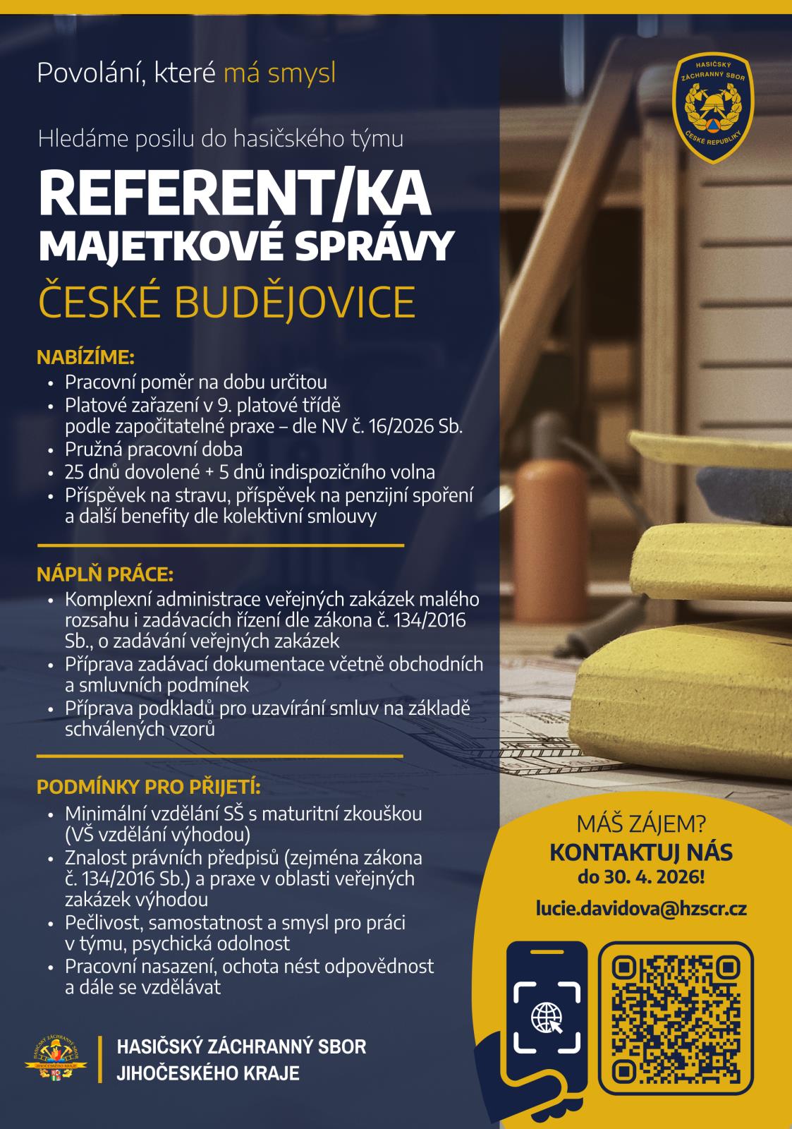 Na krajské ředitelství HZS Jihočeského kraje hledáme samostatného a spolehlivého člověka, který má zájem pracovat na ekonomickém úseku v oblasti veřejných zakázek malého rozsahu a v oblasti zadávací dokumentace a přípravy podkladů pro uzavírání smluv.