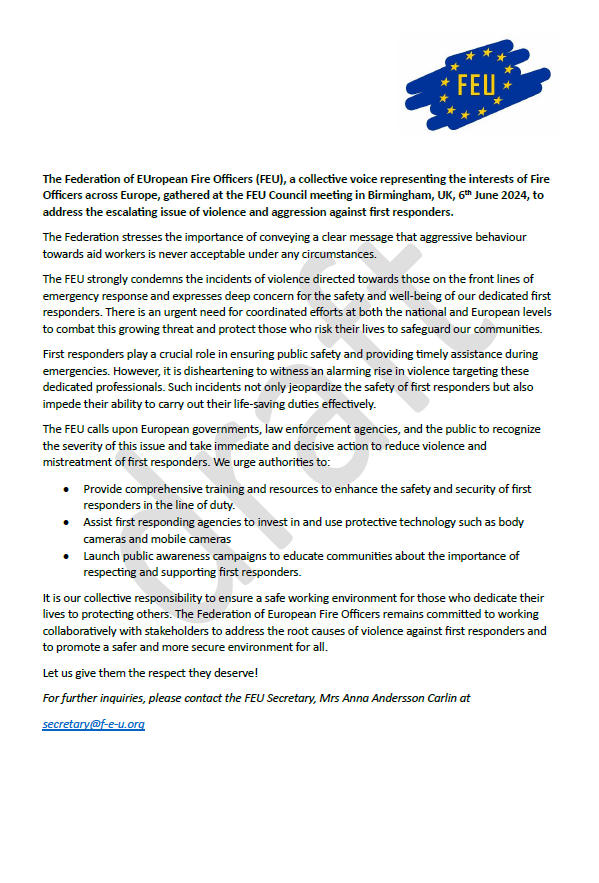 FEU důrazně odsuzuje incidenty násilí namířené proti osobám, které jsou v případě mimořádných událostí v první linii, a vyjadřuje hluboké znepokojení nad bezpečností našich záchranářů. Vnímá také naléhavou potřebu společně bojovat proti této rostoucí hrozbě na národní i evropské úrovni a ochránit ty, kteří riskují své životy při záchraně našich občanů.