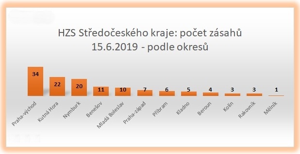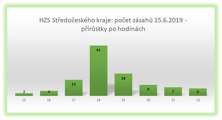 Jen mezi 18. a 19. hodinou vyslalo operační středisko v celém kraji hasiče k 41 mimořádným událostem, což je přibližně stejný počet jako za průměrný den. Nejvíce postiženou částí kraje byl okres Praha-východ, kde bylo zaznamenáno celkem 39 zásahů, z toho 24 ve městě Čelákovice. U žádné z událostí neevidujeme zranění nebo usmrcení osob.