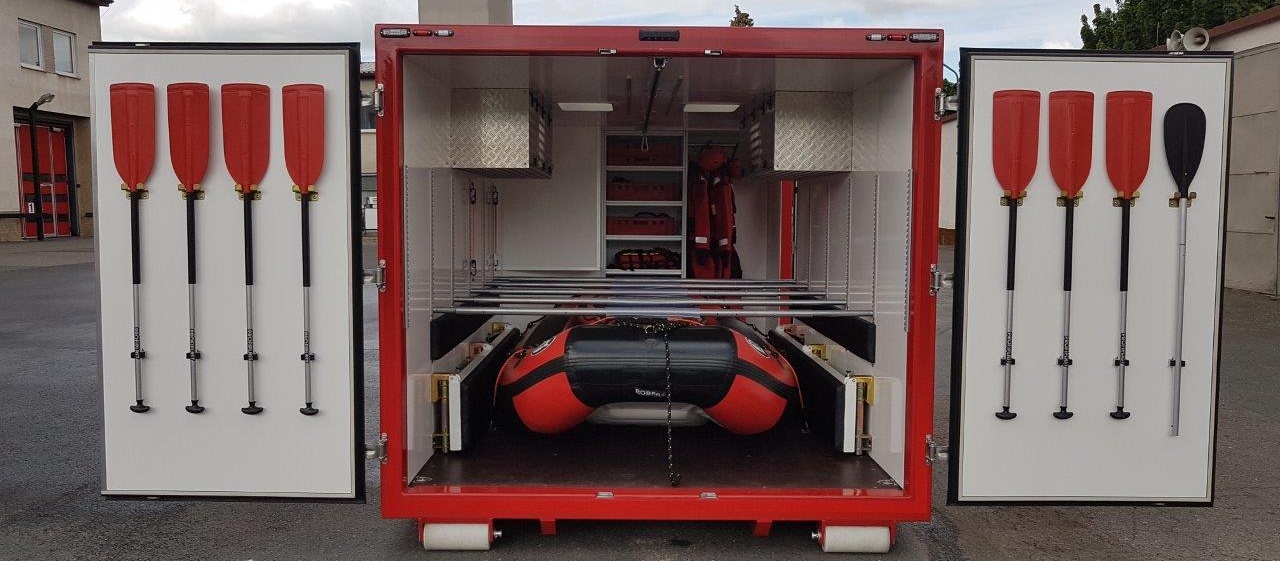 Kontejner je vybaven motorovým člunem Zodiac Futura Mark IIC ALU/370 a raftovým člunem Robfin Hobit 400. Dále má ve výbavě záchranný nafukovací paddleboard AirSurf Rescue pro rychlý a efektivní zásah pro záchranu tonoucího. Kontejner je uzpůsoben pro výbavu a technické zázemí minimálně šesti zasahujících příslušníků k záchraně tonoucích a práci na vodní hladině. Pro tepelný komfort a prvotní zázemí pro zachraňované je vybaven topením a elektrocentrálou pro zajištění samostatného fungování i v odlehlých oblastech. Záchranný lodní kontejner navazuje na systémovou linii kontejnerové koncepce u HZS Středočeského kraje.