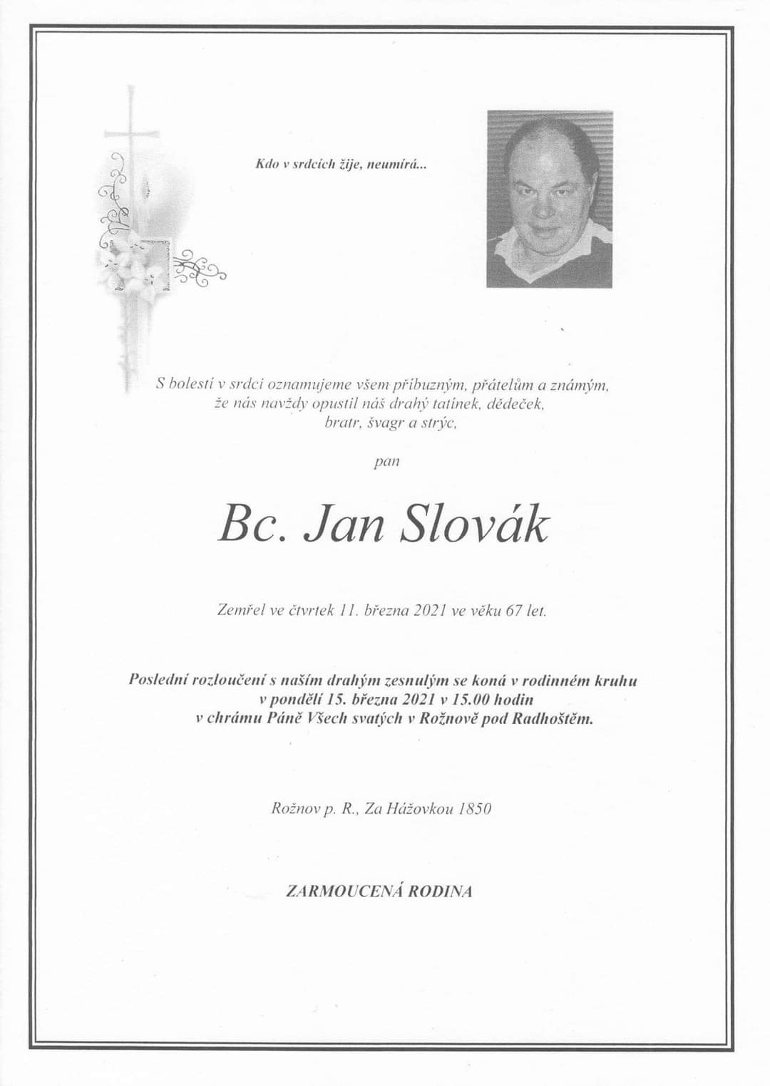 Se zármutkem oznamujeme, že nás opustil náš kolega a kamarád pan Bc. Jan Slovák.