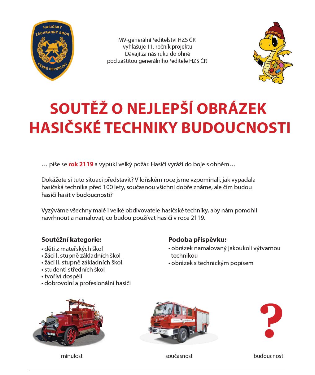 V předchozích letech jste se při našich soutěžích stali např. básníky, spisovateli, vypravěči vtipů nebo tvůrci komiksů. Letos se stanete vizionáři, jako byl například slavný Leonardo da Vinci. Navrhněte a namalujte nám, jak si představujete techniku, kterou budou hasiči používat za 100 let. Obrázek můžete doplnit i popisem toho, jak by měla technika fungovat a v čem hasičům usnadní práci.