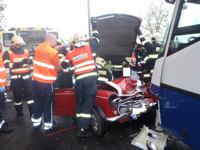 Střet osobního vozu s autobusem v Podhořanech u Ronova