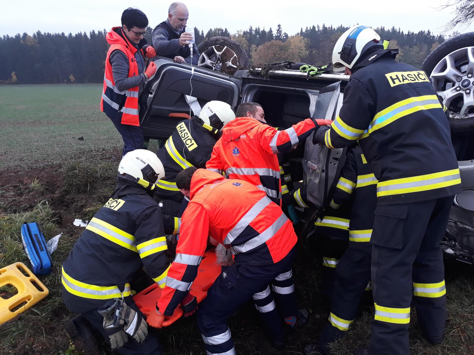 Když přijeli na místo nehody, zasahovala zde již ZZS a Policie ČR. Průzkum na místě potvrdil původní ohlášení, a to že se jedná o nehodu osobního automobilu, ve kterém zůstaly zaklíněny zraněné osoby. Havarovaný vůz značky Ford Kuga byl mimo vozovku v příkopu převrácený na střechu. Zraněný řidič byl již z auta venku a již ho ošetřovala ZZS. Zasahující hasiči na vyproštění dvou spolujezdkyň museli použít hydraulické vyprošťovací zařízení. Vytvořili si přístupovou cestu k oběma zraněným, které po nasazení páteřního fixátoru vyprostili pomocí páteřní desky. Společně se zdravotníky ZZS obě transportovali do sanitek.