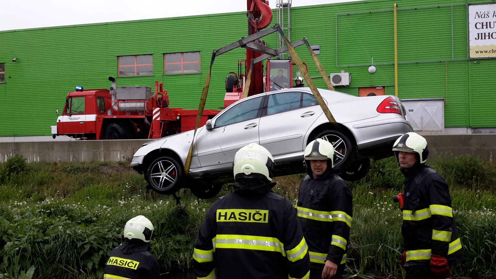 osob. Hasiči na místo vyjeli s rychlým zásahovým automobilem, cisternou a automobilovým jeřábem. Průzkum na místě nehody ukázal, že jde o osobní auto značky Mercedes Benz, ve kterém cestují dvě osoby. Hasiči vyprostili zdravotně indisponovaného řidiče (berle). Jeho spolujezdkyni, která si stěžovala na výraznou bolest zad, pak vyprošťovali tak, že přes stoku položili dva nastavovací žebříky, na které umístili vakuová nosítka ZZS. Opatrně pak paní na nosítka přenesli. Společně se zdravotníky ZZS pak paní odnesli do druhé sanitky. Zároveň s vyproštěním zasahující jednotka zajistila havarovaný Mercedes protipožárním opatřením.