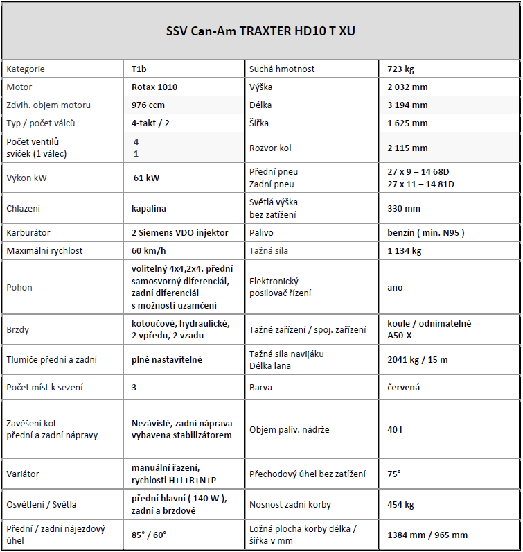 Cena jedné čtyřkolky je 626 100 korun. Všechny čtyřkolky byly pořízeny s přispěním měst Beroun, Rakovník a dalších subjektů. Stroj je osazen dvouválcovým čtyřdobým zážehovým motorem o objemu nejméně 950 cm3. Má pohon na všechna čtyři kola s tím, že zadní náprava je vybavena diferenciálem s uzávěrkou diferenciálu a přední samosvorným diferenciálem, což je zejména v lesním terénu přínosem. Převodovka je automatická s možností volby pomalého terénního režimu. Přední i zadní nápravy disponují kotoučovými brzdami. Zajímavé jsou i geometrické rozměry vozidla při své celkové hmotnosti, a to přední nájezdový úhel nejméně 75° a světlá výška nejméně 250 mm (bez zatížení).