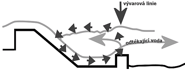 Člověk takto zachycený pak nemůže od jezu odplavat, protože je neustále strháván proudem zpět. Jakmile se dostane až pod přepad, je zatlačen proudem vody ke dnu a po chvíli ho voda zase tlačí nahoru. Tím zde rotuje, ztrácí orientaci a nemá čas na svou záchranu. Jeho priorita je najít hladinu a nadechnout se, než je zase tlačen ke dnu.