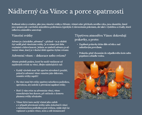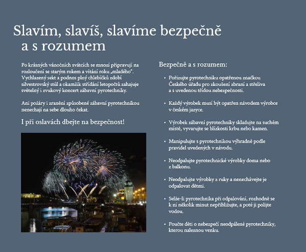 11. prosince 2018 (Ivana Svitáková) - V období od 24. 12. do 31. 12. 2017  vzniklo na území hl. m. Prahy celkem 36 požárů. Požáry způsobily jedno zranění, přímé škody na majetku byly vyčísleny na 1, 28 milionů korun, hasiči evakuovali před nebezpečím požáru celkem 3 osoby a zachránili 5 lidských životů. Hasiči při těchto požárech uchránili hodnoty za 6 milionů korun.
