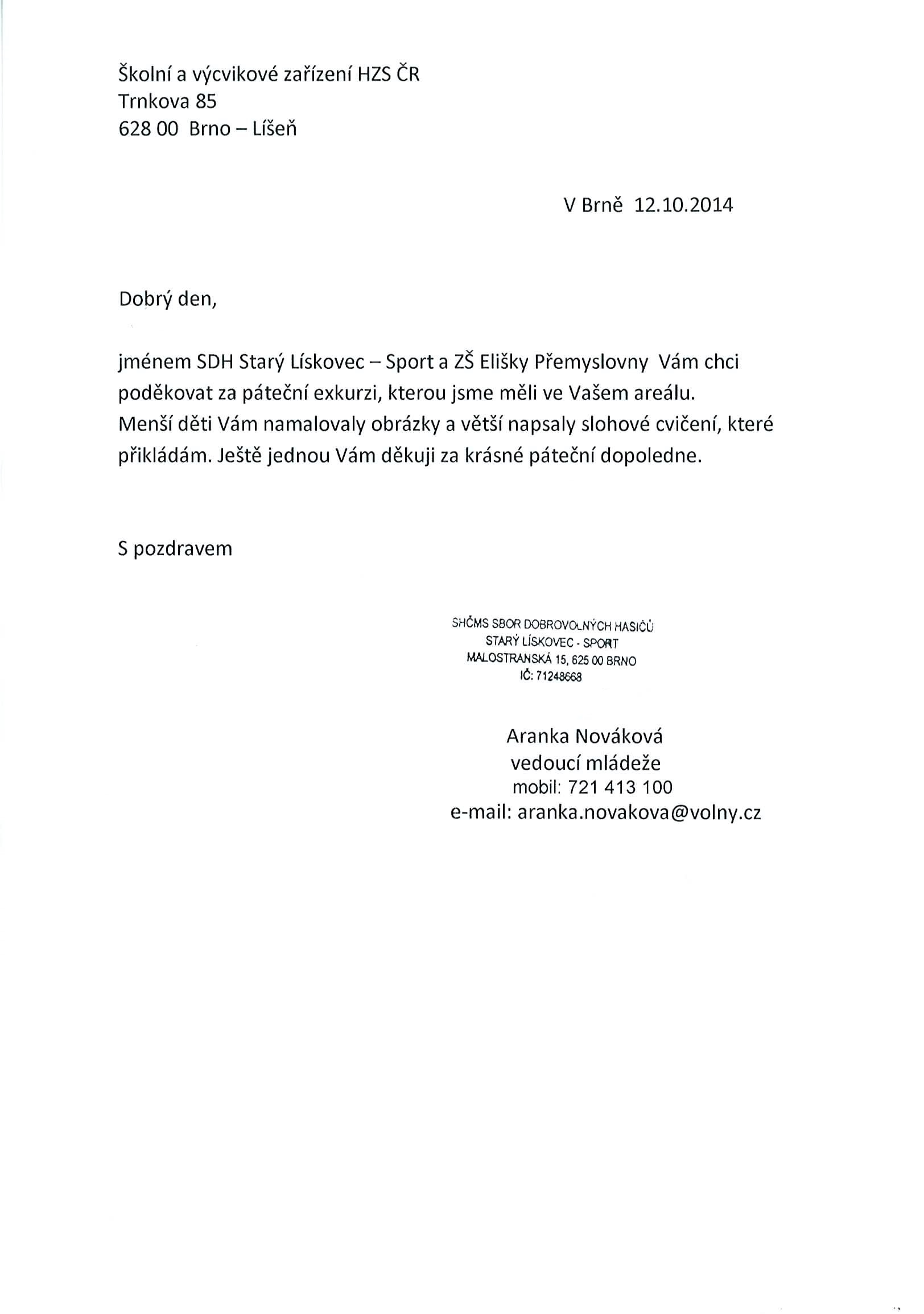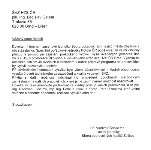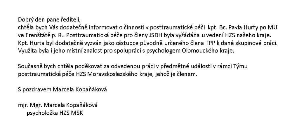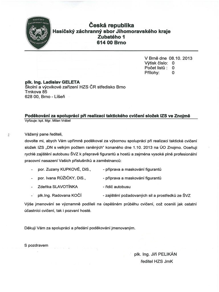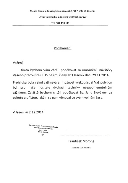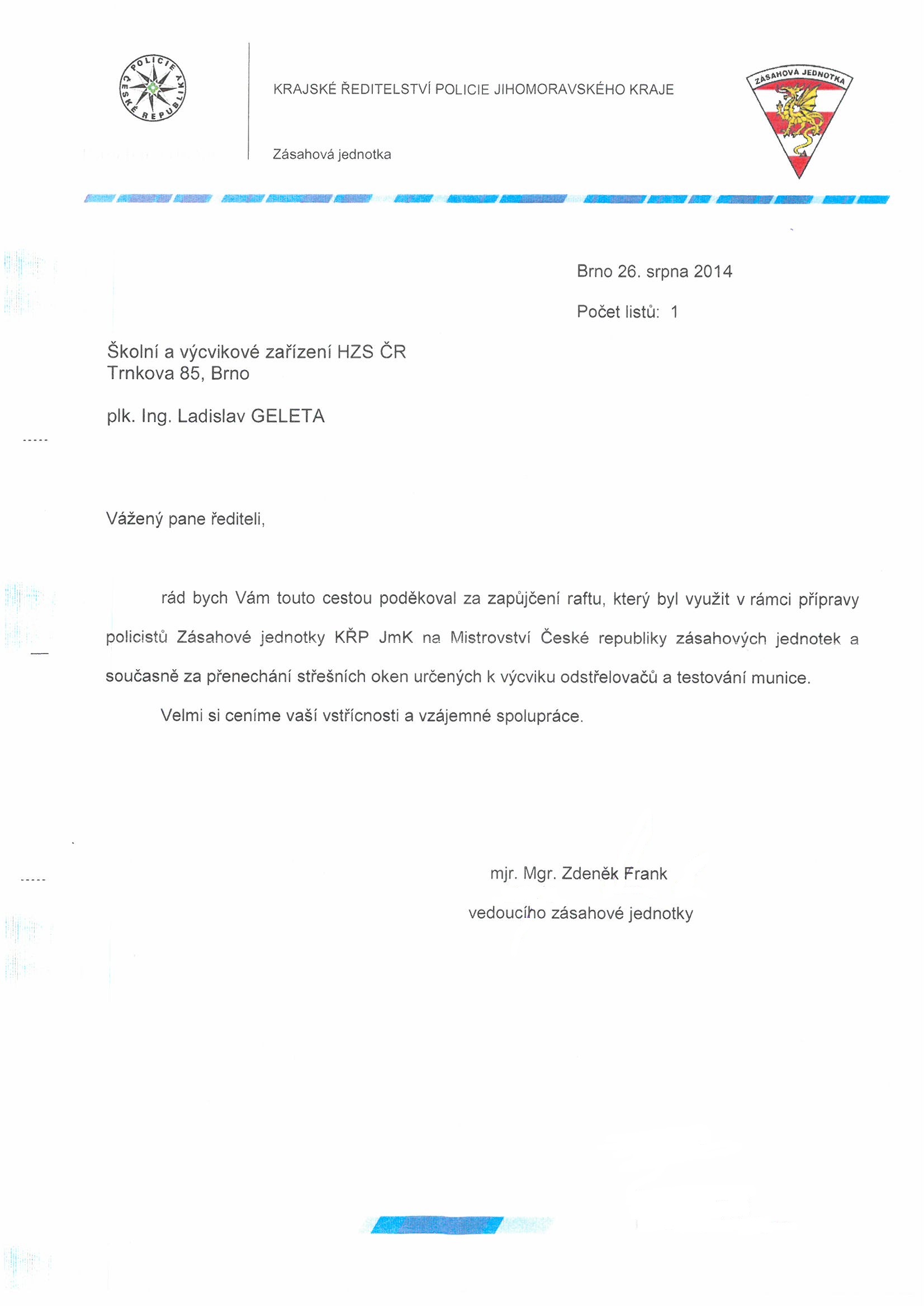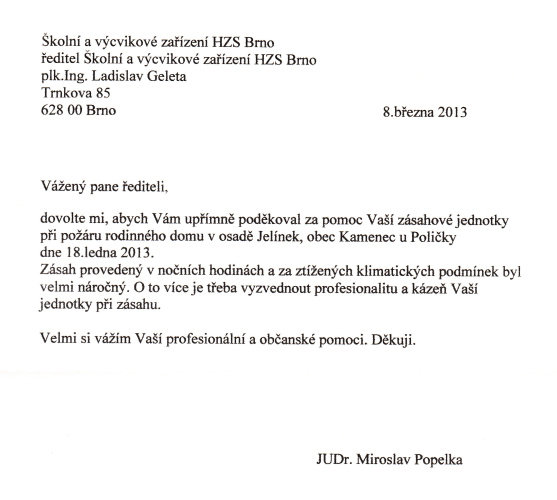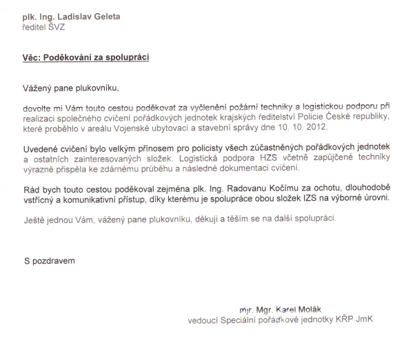 - Poděkování vedoucího oddělení IZS a služeb, HZS Jihomoravského kraje (25.11.2014)