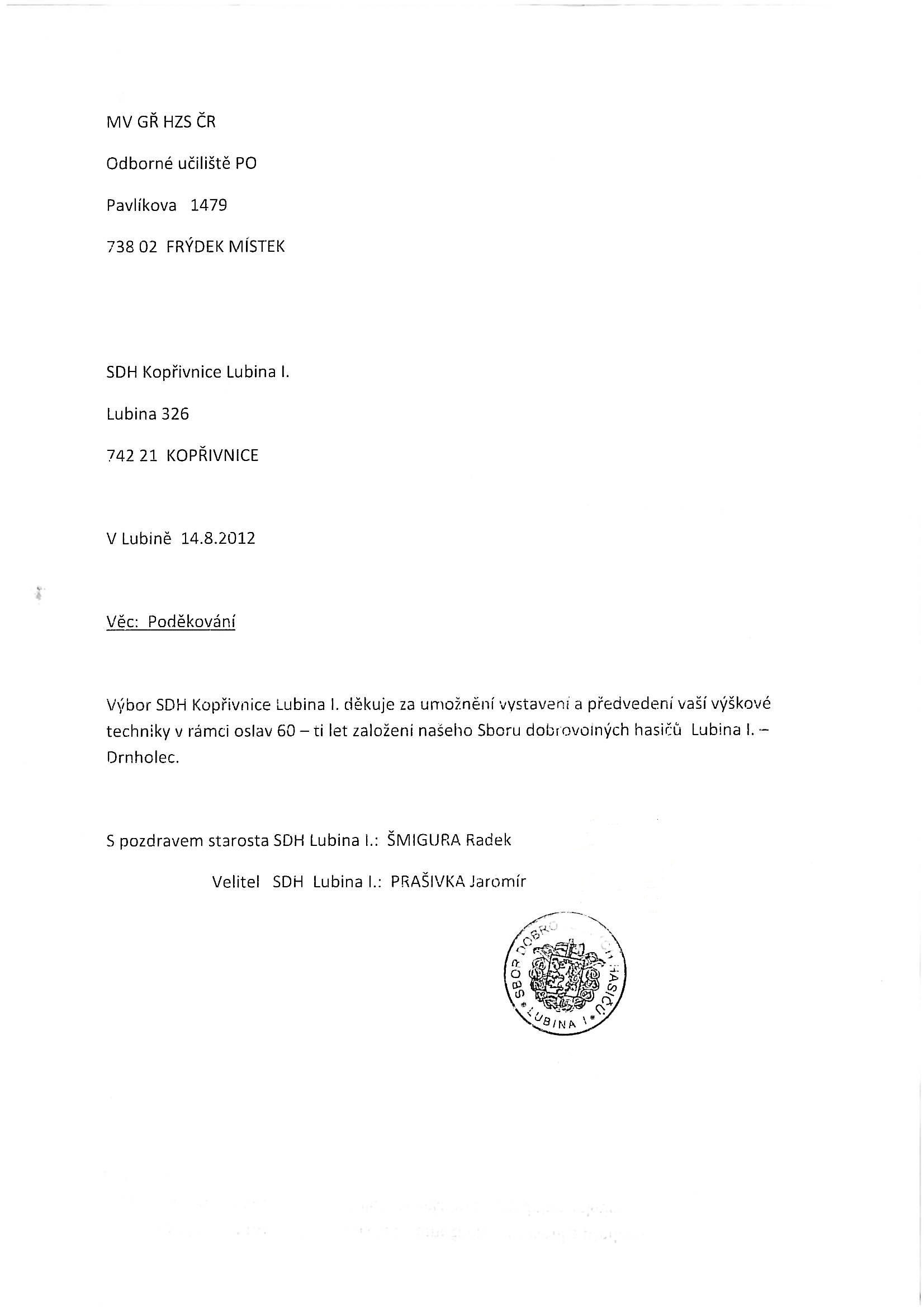 - Poděkování starosty obec Lovčičky (13.6.2016)