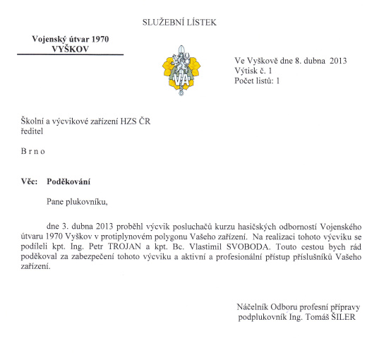 - Poděkování velitele HZSp JE Dukovany (1.3.2016)