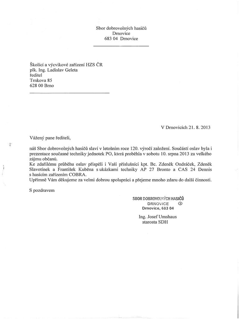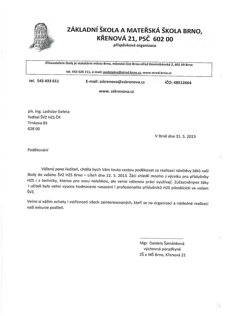 - Poděkování ředitele Územního odboru Brno-město, HZS Jihomoravského kraje (27.6.2014)