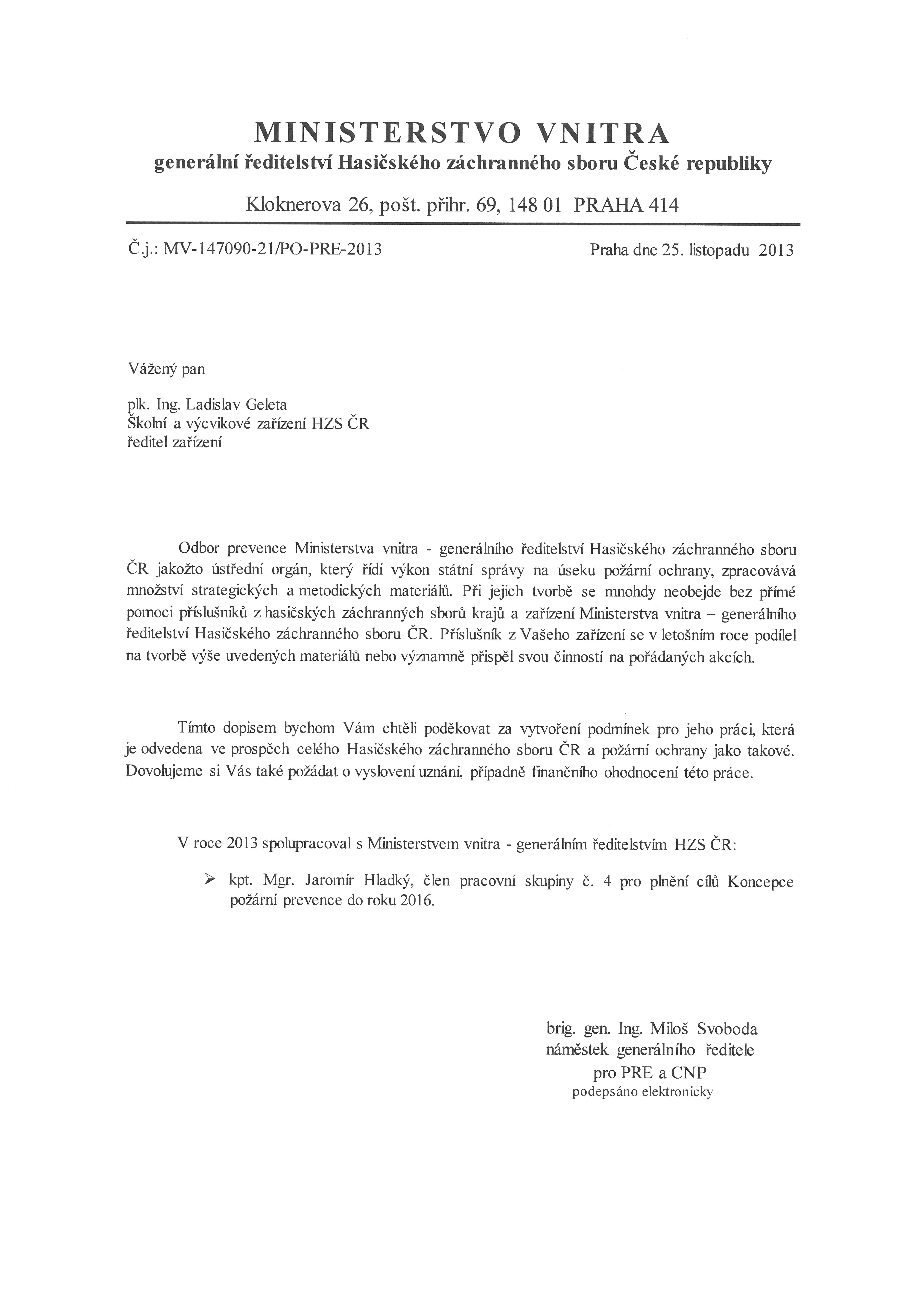 - Poděkování náměstka generálního ředitele HZS ČR (25.11.2013)