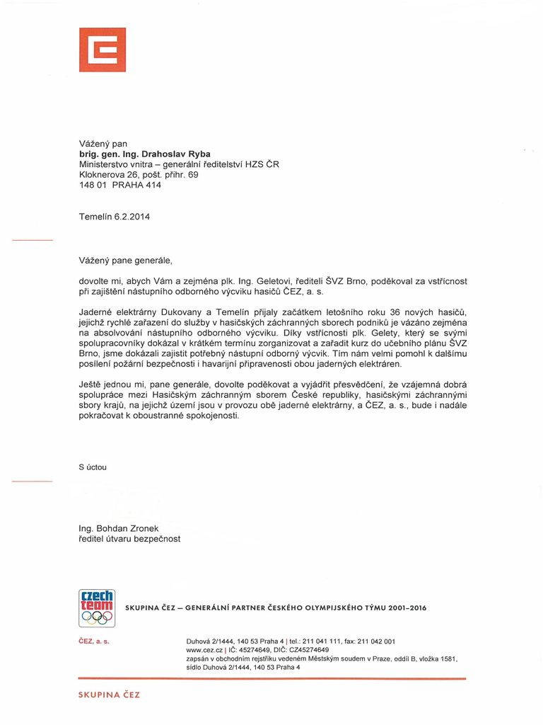 - Poděkování ředitele útvaru bezpečnosti ČEZ a. s. (6.2.2014)