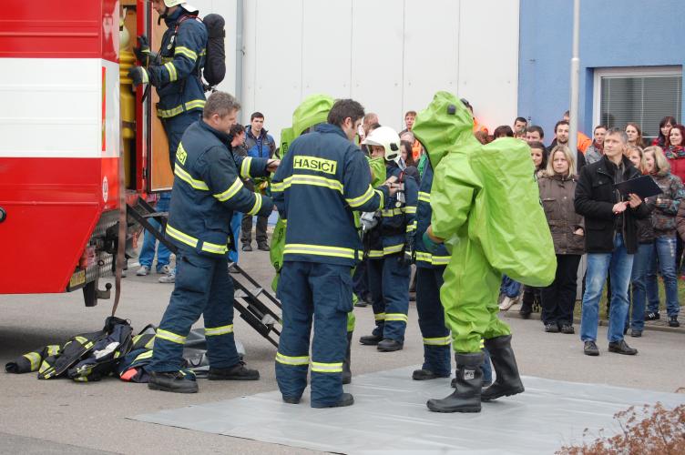 Ihned po příjezdu hasičů na místo bylo průzkumem zjištěno, že došlo k úniku neznámé látky v administrativní budově této firmy.