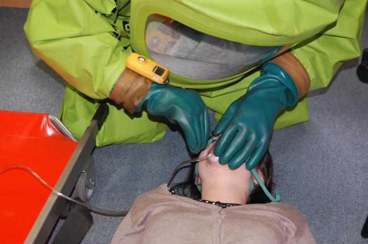 Hasiči v přetlakových oblecích prohledali objekt. Průzkumná skupina v oblecích nejvyšší ochrany vybavena detektory plynů vyhledávala ohrožené osoby jedovatým plynem.