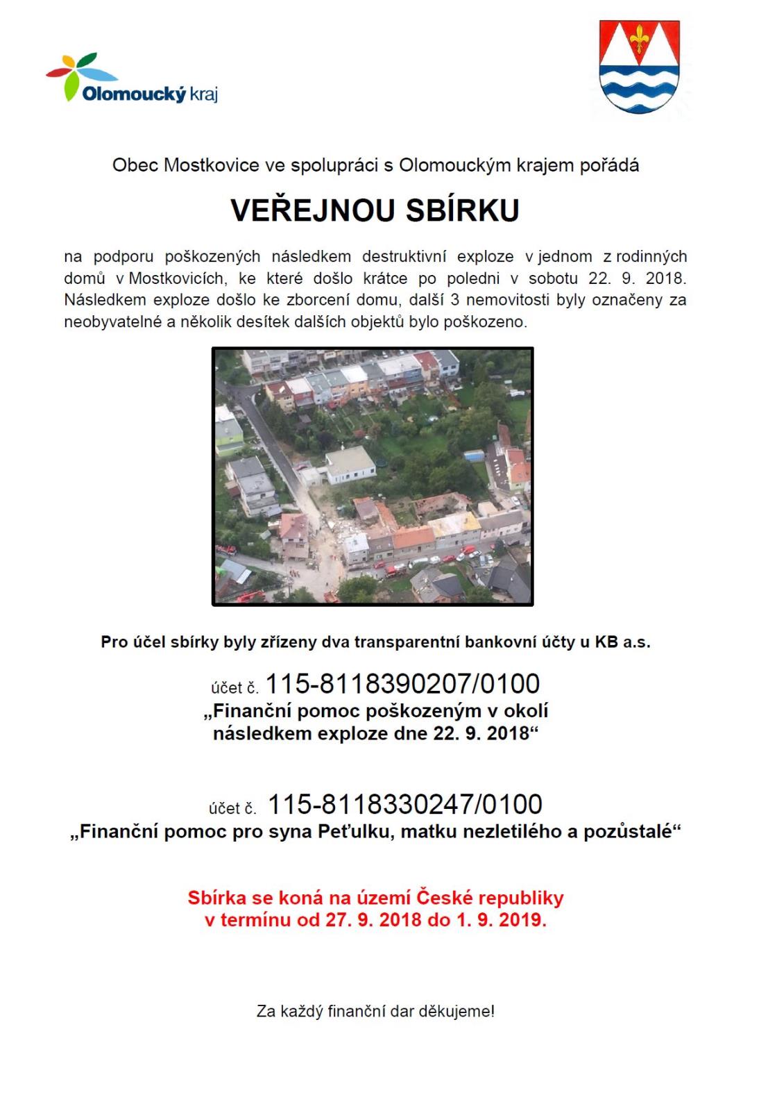 Obec Mostkovice spolu s Olomouckým krajem vyhlásila dvě veřejné sbírky na podporu poškozených následkem destruktivní exploze v jednom z rodinných domů v Mostkovicích.