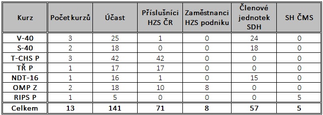 Celkem jsme na našem pracovišti ve výše uvedeném období proškolili 141 frekventantů. V následující tabulce je uveden seznam konkrétních kurzů a jejich obsazenost.