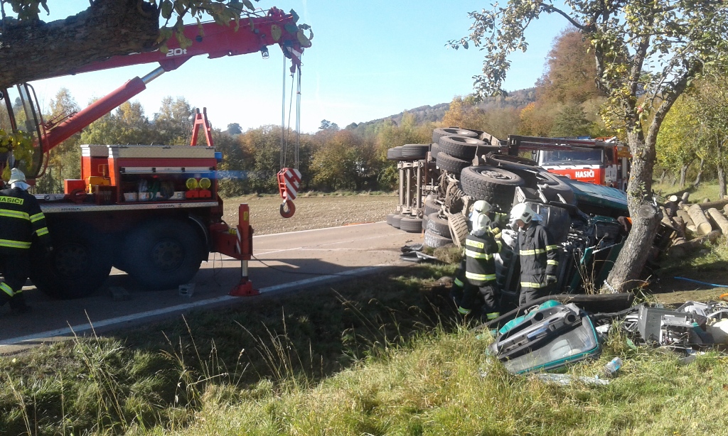 Kamion převážející kulatinu se převrátil do příkopu a po boku setrvačností ujel ještě několik metrů, než se úplně zastavil. Řidič zůstal ve zdemolované kabině zaklíněný a zavalený hlínou, co hrnul kamion před sebou. Kamion následkem nehody začal navíc hořet.