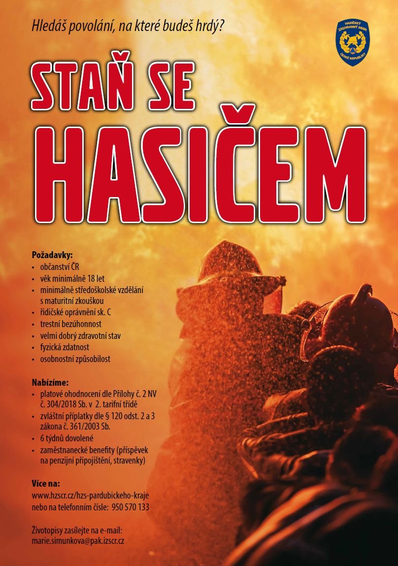 Zájemci o práci u hasičů v Pardubickém kraji se můžete hlásit na e-mail: marie.simunkova@pak.izscr.cz.
