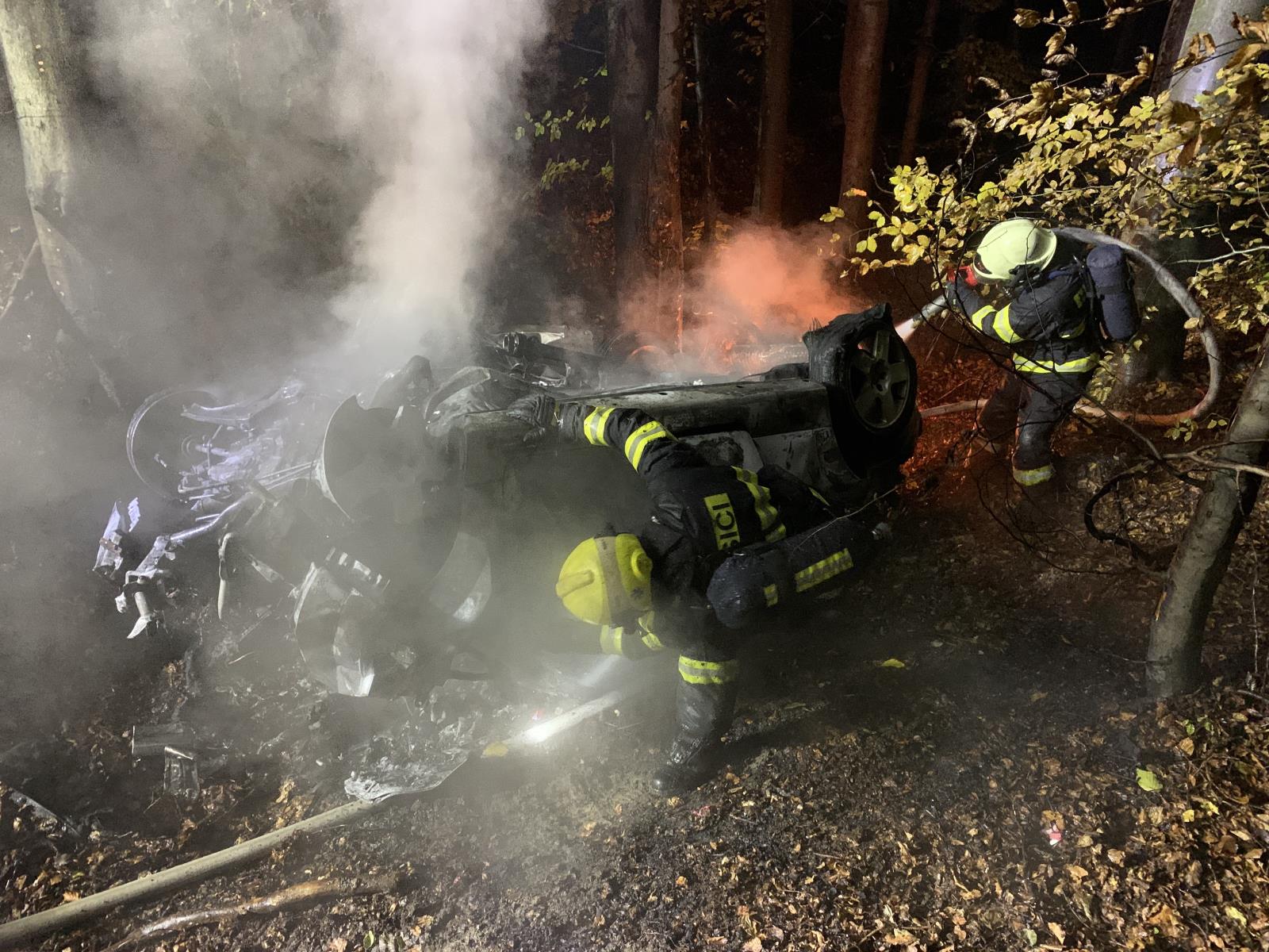 Po příjezdu na místo průzkumem hasiči zjistili, že vozidlo se nachází mimo komunikaci na kraji lesa, převrácené na střeše a celé v plamenech. Hasiči ihned k likvidaci požáru použili vysokotlaký proud vody a následně C proud. Z vozidla vytékaly pohonné hmoty, které stále hořely a komplikovaly tak likvidaci požáru. Jakmile to situace dovolila, byl na místo nehody povolán vyprošťovací automobil, pomocí něhož hasiči vytáhli vozidlo zpět na cestu. Poté hasiči z vozidla vyprostili dvě osoby bez známek života.
