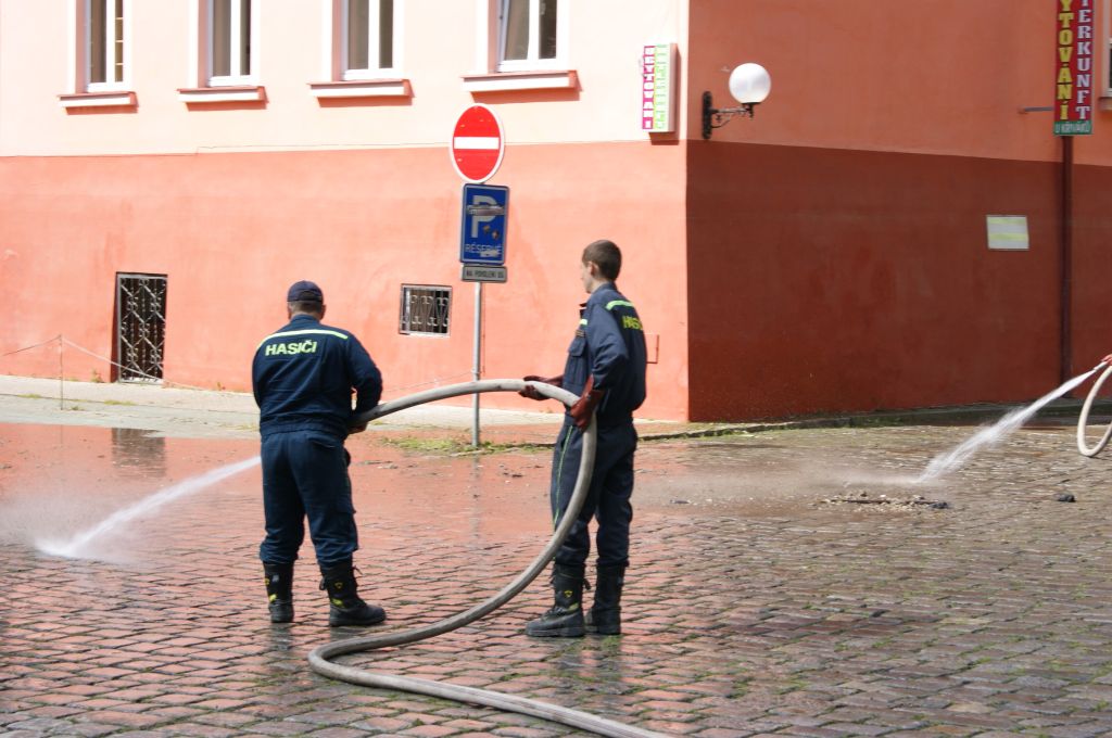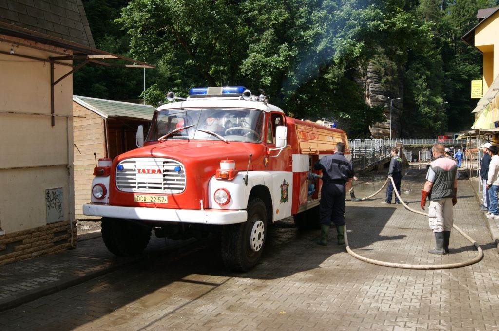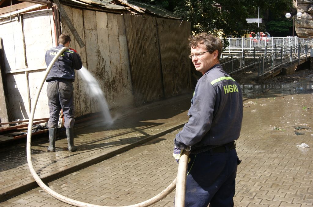 Ve Hřensku dnes po povodni uklízely jednotky Sboru dobrovolných hasičů Velký Šenov a Labská Stráň. Hasiči splachovali a odklízeli nánosy bahna, kamení a dalších předmětů na nábřeží řeky Kamenice.