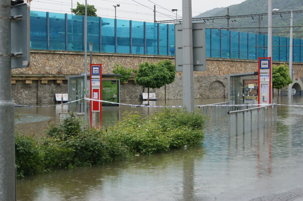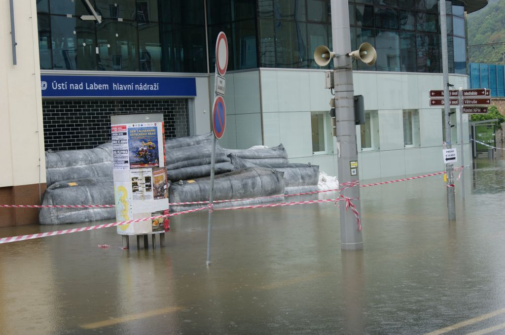 V Ústí nad Labem stále probíhá stavění a upevňování hrází z pytlů v dosud vodou nezasažených částech v centru města. Čeká se na hlavní povodňovou vlnu. Voda už zasáhla celé přednádraží.