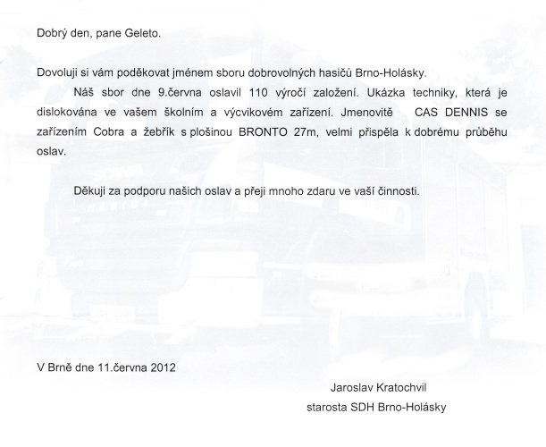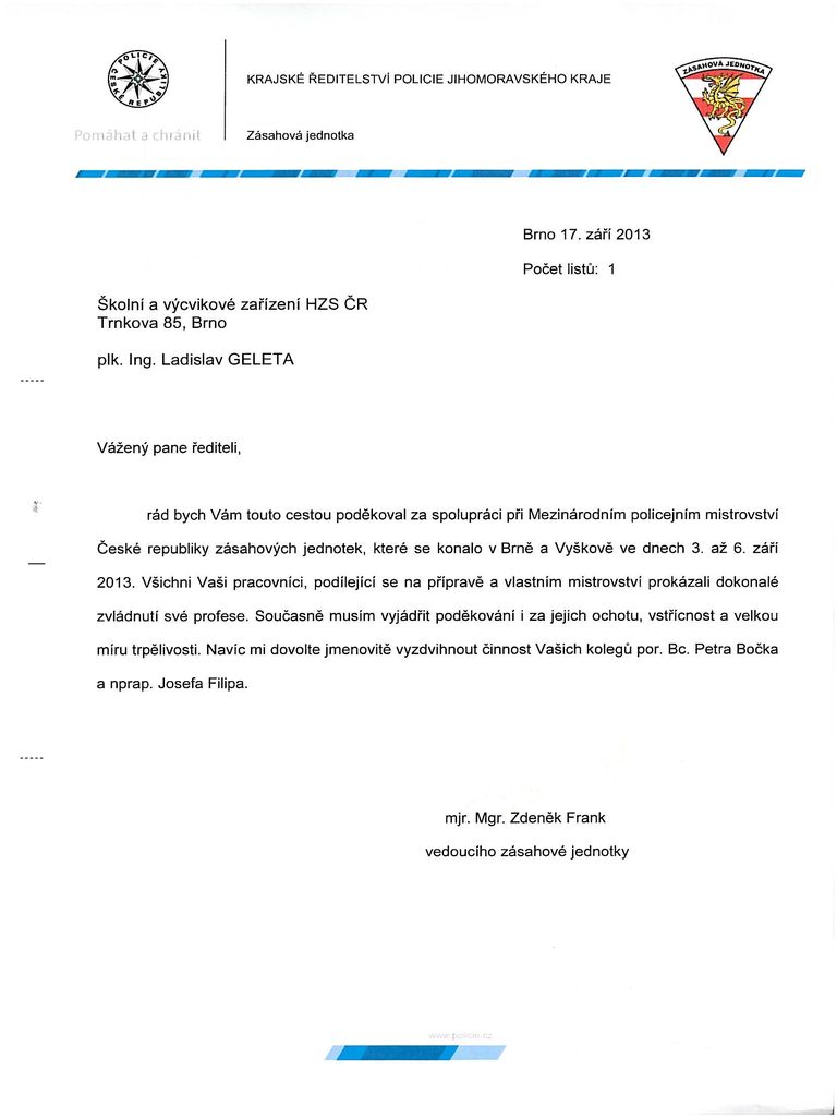 - Poděkování ředitele Územního odboru Brno-město, HZS Jihomoravského kraje (27.6.2014)