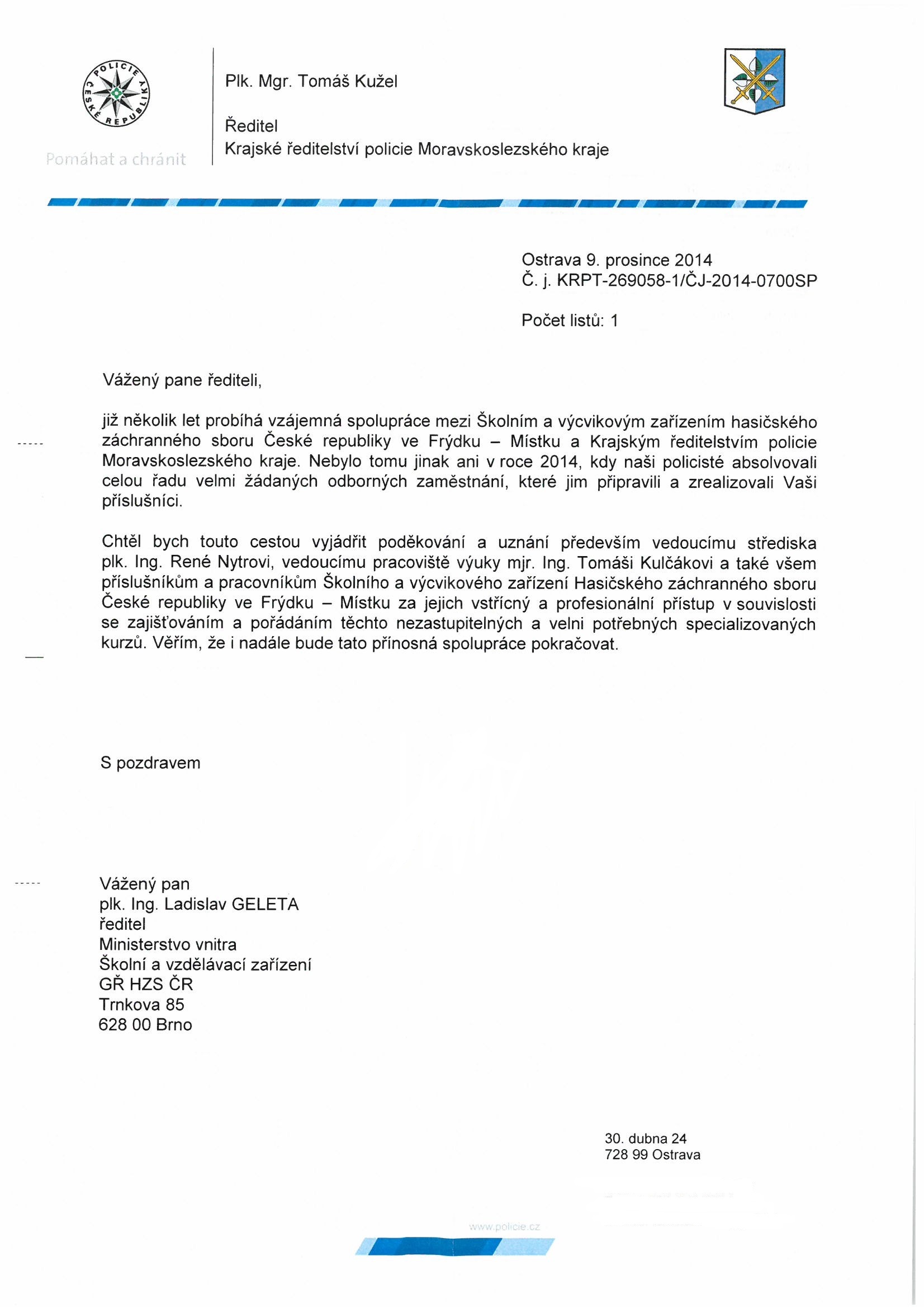 - Poděkování ředitele Krajského ředitelství policie Moravskoslezského kraje (9.12.2014)