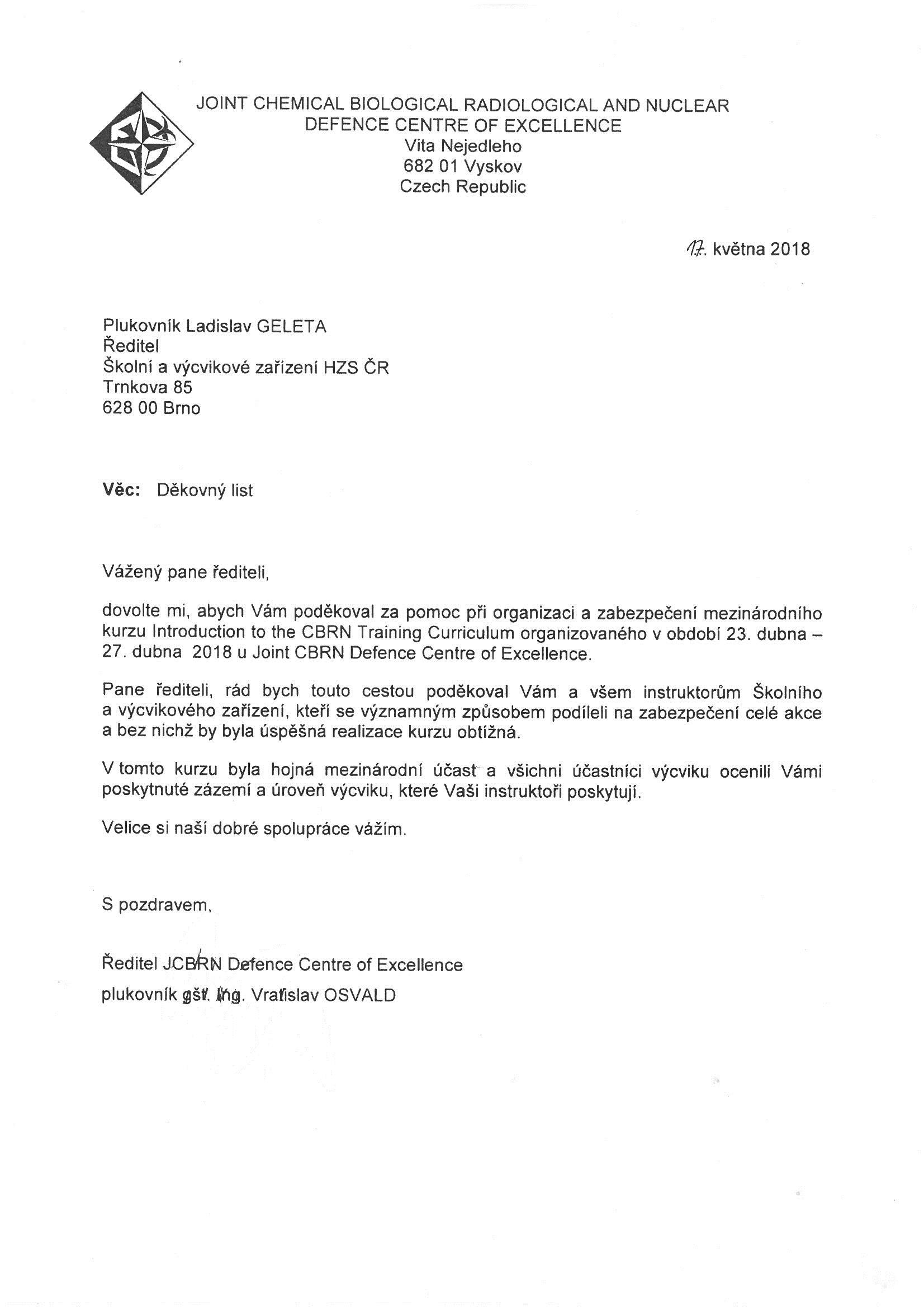 - Poděkování ředitele JCBRN Defence Centre of Excellence (17.5.2018)