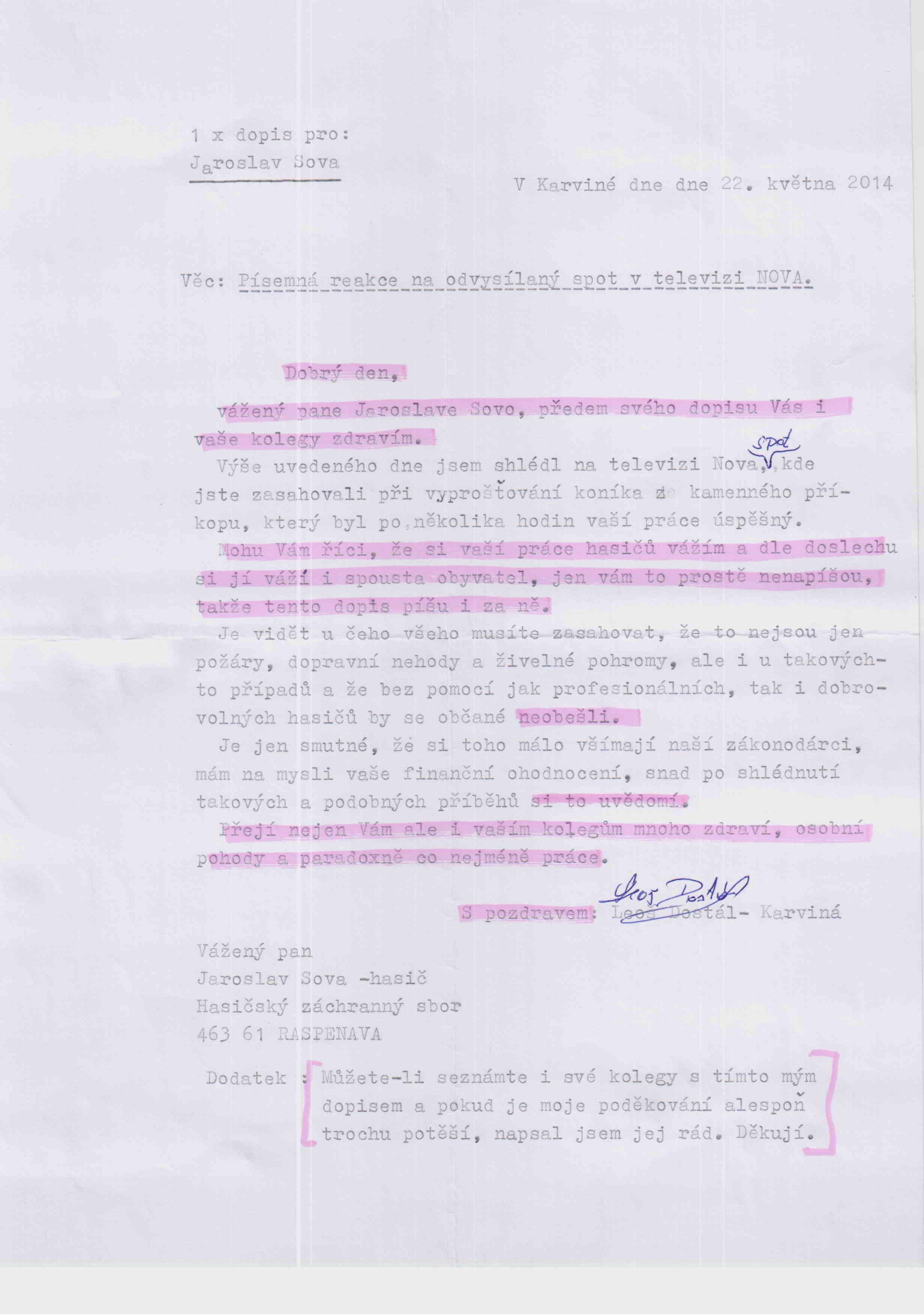 Po odvysílání reportáže TV Nova, ve které hasiči z Raspenavy zachraňovali v lese koně po pádu mezi balvany, jsme dostali na stroji psaný děkovný dopis. Skutečně nás všechny potěšil.