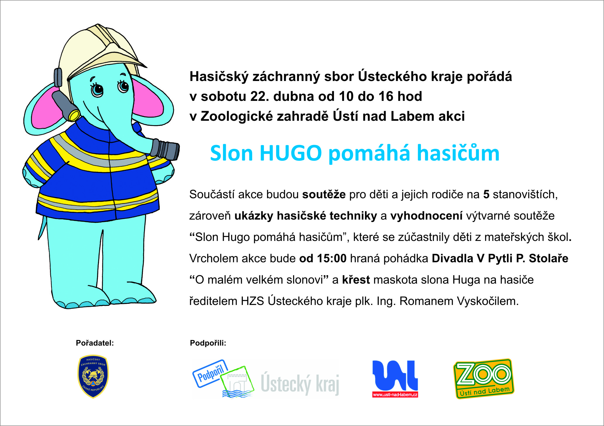 Slon Hugo 4.jpgSoučástí akce, která proběhla v areálu ústecké ZOO, byly akce a soutěže pro děti a jejich rodiče na pěti stanovištích, zároveň ukázky hasičské techniky a hlavně od 15:00 divadelní představení pohádky O malém velkém slonovi v provední Divadla v pytli, vyhodnocení výtvarné soutěže, které se zúčastnily děti z mateřských škol, a křest maskota slona Huga na hasiče ředitelem Hasičského záchranného sboru Ústeckého kraje plk. Ing. Romanem Vyskočilem.