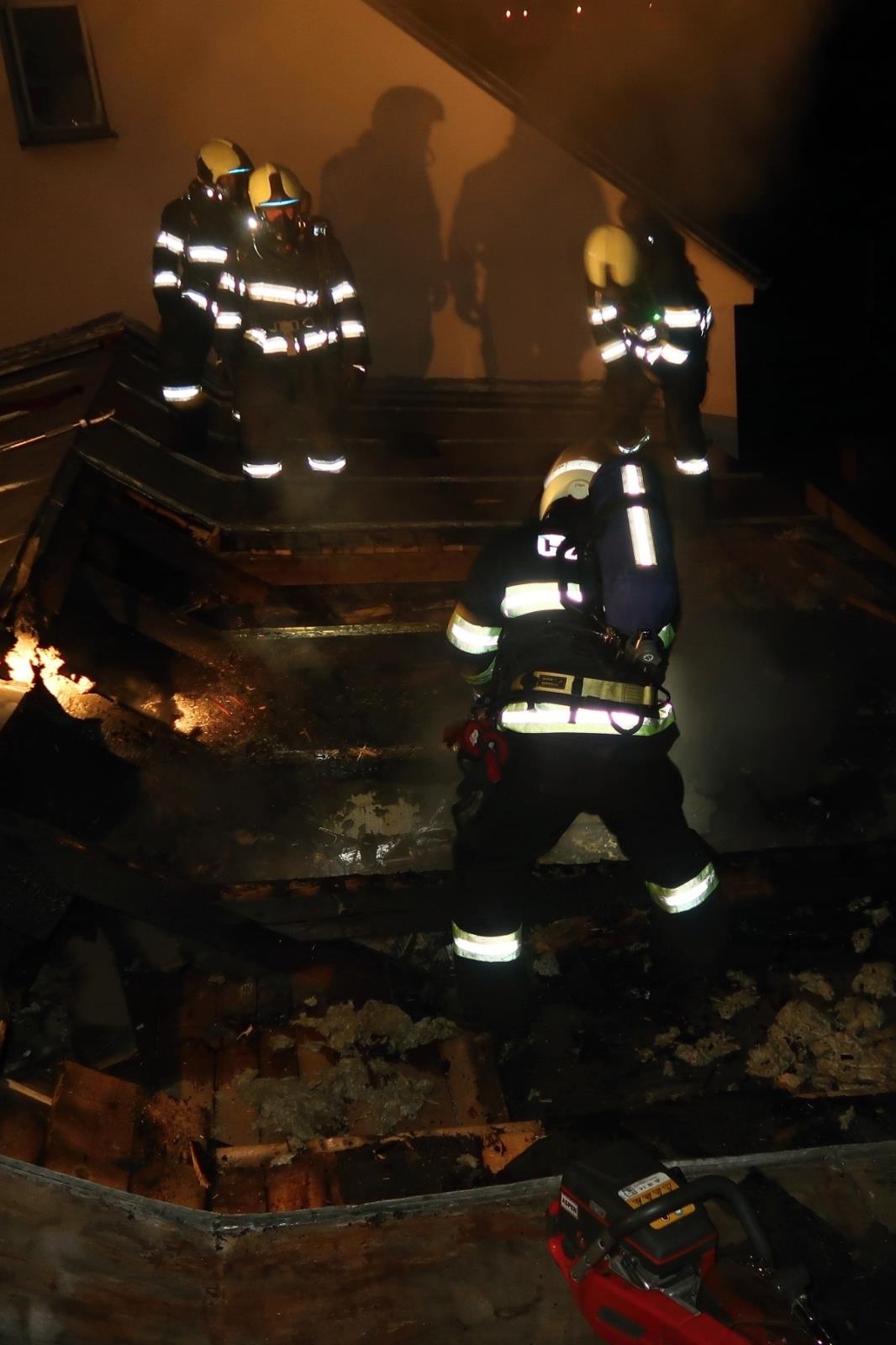Po lokalizaci požáru jednotka zahájila rozebírání střešního pláště za využití automobilové plošiny. Když hasiči odstranili plechovou krytinu, teprve pak nalezli ohnisko požáru – hořící dřevěnou konstrukci střechy a izolaci na ploše přibližně 16 m2. Jednotka žhnoucí části střechy motorovou pilou odřezala a venku na volném prostranství je dobrovolní hasiči dohasili. Nosné trámy byly uhašeny vodními proudy. Závěrečný průzkum pak velitel provedl opět termokamerou.