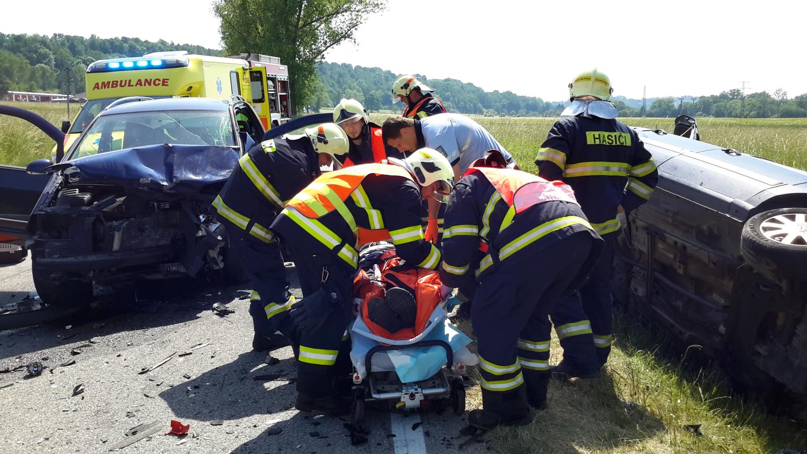 V havarovaných vozech zůstaly zaklíněné dvě osoby, třetí zraněná osoba byla mimo havarované vozy. Zasahující hasiči okamžitě zahájili vyprošťování, k němuž museli použít hydraulické vyprošťovací zařízení. Ve spolupráci se zdravotníky ZZS transportovaly obě vyproštěné osoby do vrtulníku LZS. Třetí zraněná osoba byla do nemocnice převezena sanitkou. Následovalo nezbytné zajištění havarovaných aut proti vzniku požáru a kontrola úniku provozních kapalin. Po odvezení všech třech zraněných a zadokumentování nehody Policií ČR hasiči dokončili úklid vozovky.