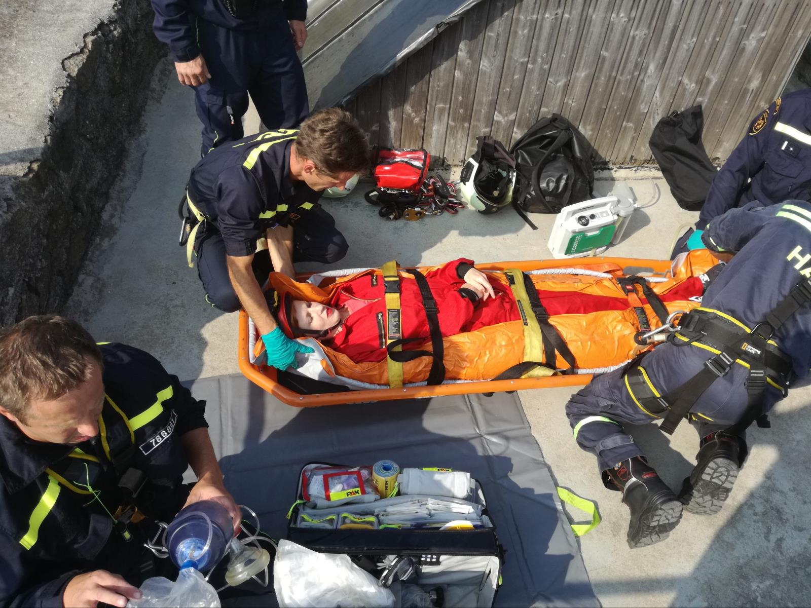 Cvičení pokračovalo tak, že velitel zásahu ve spolupráci se zdravotníkem družstva určil činnost jednotlivých příslušníků, a to především v pokračování resuscitace, a nařídil dopravit na místo automatický externí defibrilátor. Přístroj vyhodnotil situaci a nedoporučil výboj – příslušníci tedy museli pokračovat v resuscitaci. Na nácvik resuscitace hasiči použili jako cvičební pomůcku „ambumana“ a také cviční defibrilátor. Následně „zraněné“ figurantce zafixovali nohy do vakuové dlahy a celou ji zafixovali do transportní vany. Po úzkém a strmém schodišti ji tak transportovali z věže dolů.