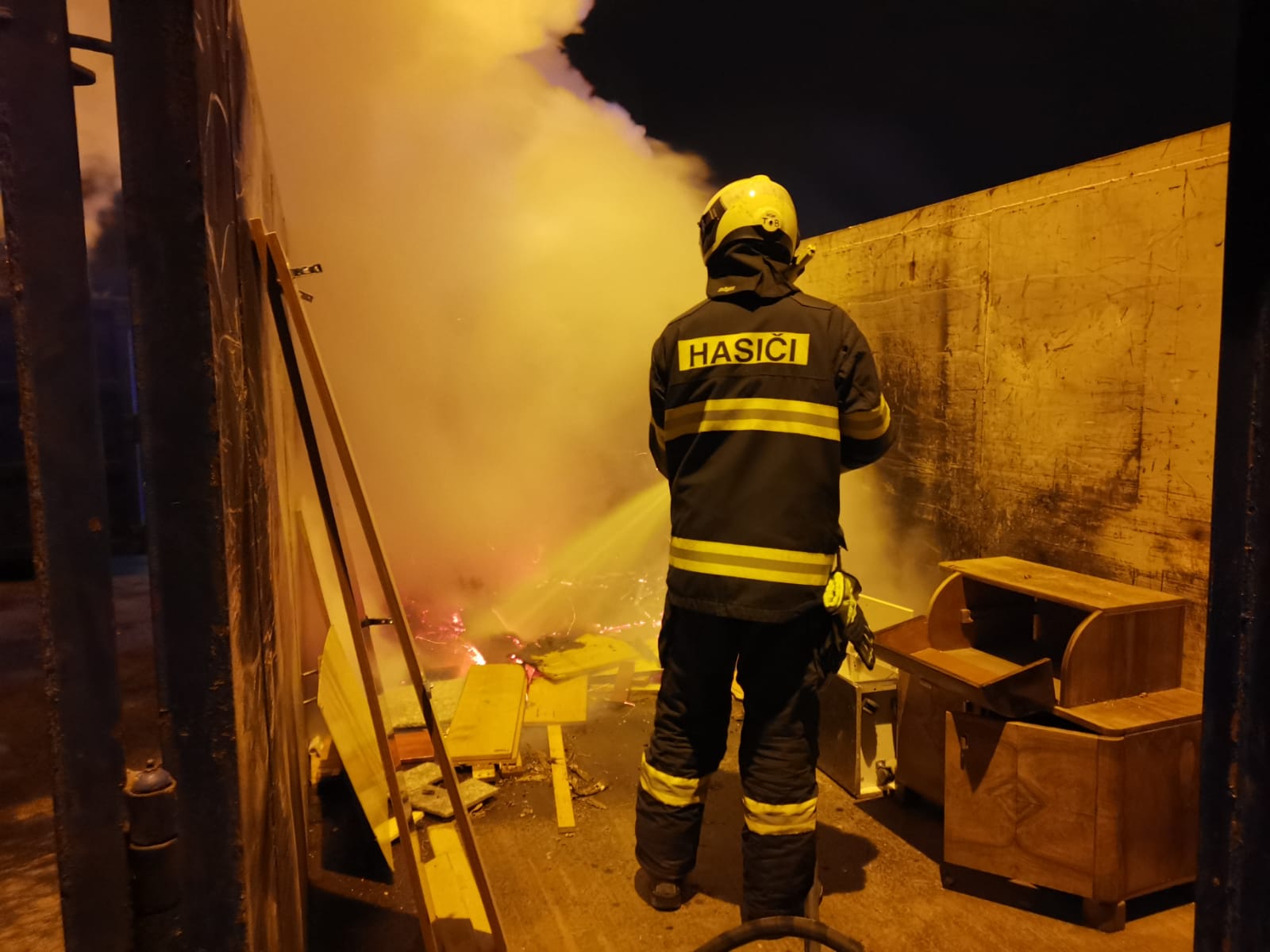 Jednotka na místě průzkumem zjistila, že v ulici Plukovníka Malého hoří odpadní dřevo, které bylo uloženo ve volně přístupném velkém plechovém kontejneru. Hasiči požár lokalizovali a zlikvidovali vysokotlakým proudem. Požárem nevznikla žádná škoda.
