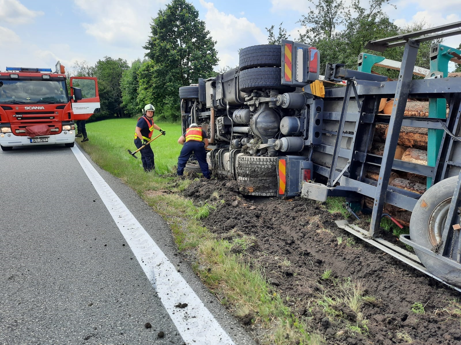 čtyřmetrových délkách, skončil převrácený na bok v příkopu, jeho řidič vyváznul bez zraněn. Hasiči dalším průzkumem zjistili, že z nádrží nevytékají žádné provozní kapaliny. Policie ČR silnici v místě nehody zcela uzavřela a stanovila objízdnou trasu. Řidič kamiónu si mezitím objednal náhradní vozidlo a také vůz s hydraulickou rukou pro přeložení nákladu. Po ukončení překládky se k nehodě dostavilo auto odtahové služby s vyprošťovacími jeřáby. Hasiči před zahájením vyproštění preventivně obsypali sorbentem palivové nádrže. Když stál kamión znovu na kolech na silnici, hasiči zametli z vozovky nahrnutou zeminu. Nehodu šetřila Policie ČR.