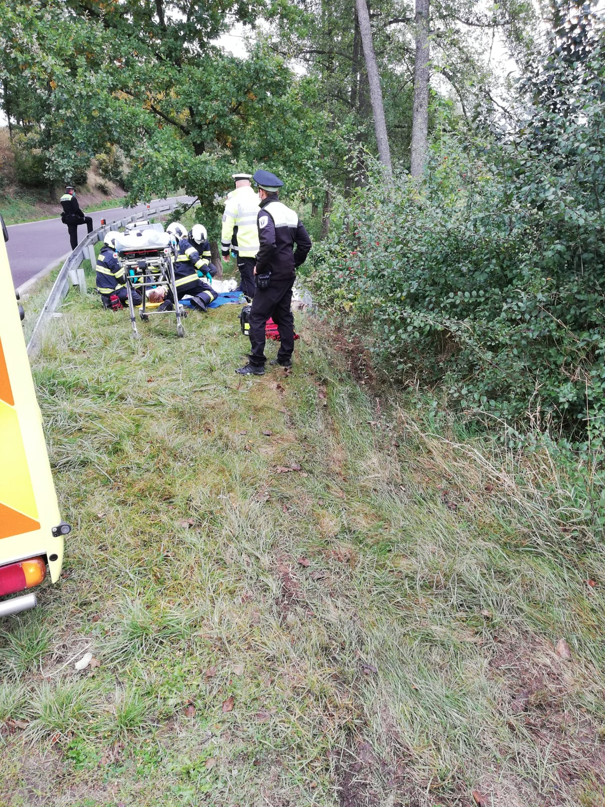K nehodě vyjely všechny složky intergovaného záchranného systému. Z jednotek požární ochrany to byli profesionální hasiči ze stanice Dačice. Jednotka nalezla havarovaného motorkáře včetně jeho motorky až v blízkém potoce. Zraněného a promočeného motorkáře hasiči vytáhli z vody a pomohli zdravotníkům ZZS s jeho ošetřením. Následně ho přenesli do sanitky. Tou byl odvezen na heliport do Dačic, odkud byl do nemocnice transportován letecky vrtulníkem LZS.