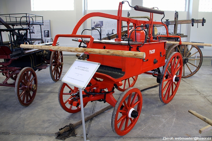 KONĚSPŘEŽNÁ RUČNÍ STŘÍKAČKA F. Smekal, Praha - Smíchov 1894 ZAPŮJČIL SBOR DOBROVOLNŹCH HASIČŮ PACOV